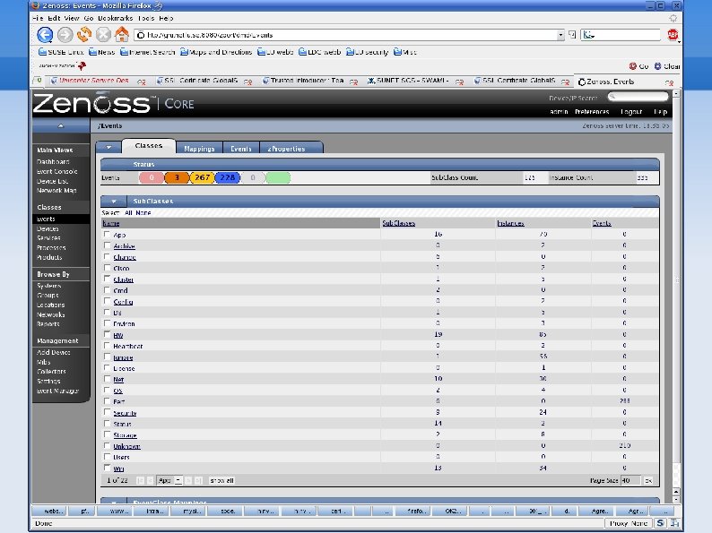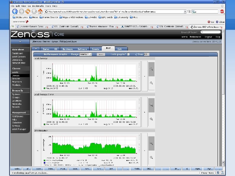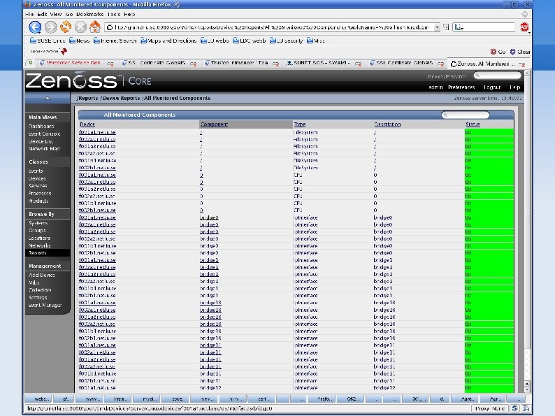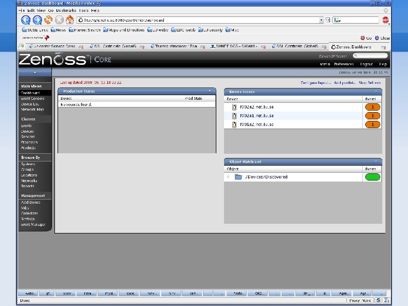 Övervakning Zenoss SMNP övervakning Huvudsakligen kontroll av datorns arbete Lite knepig konfigurering Kan vara svårtolkad Kan övervaka allt i datorn