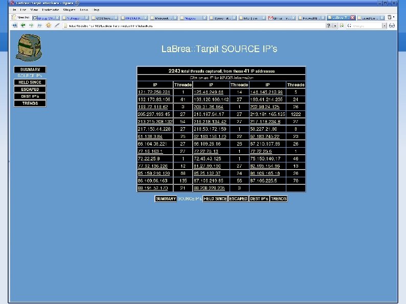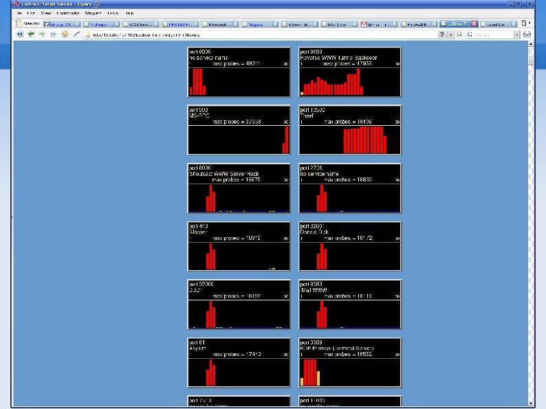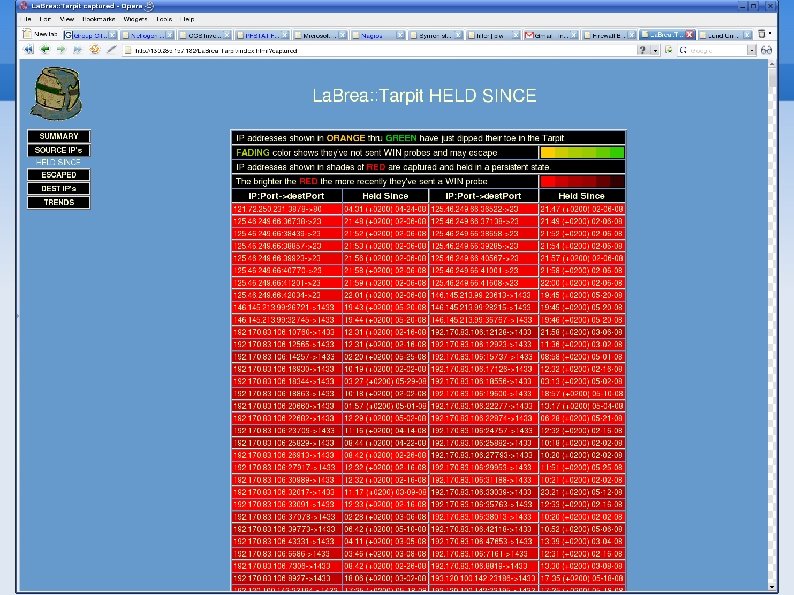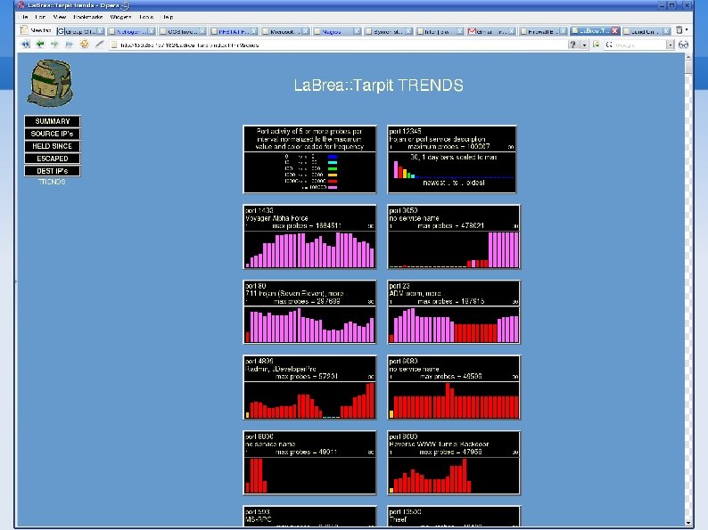 Övervakning La. Brea tarpit Fungerar på darknet eller vanligt nätsegment Fångar upp scannande datorer Håller kvar dem så längre som möjligt Visar trender och populära attacker