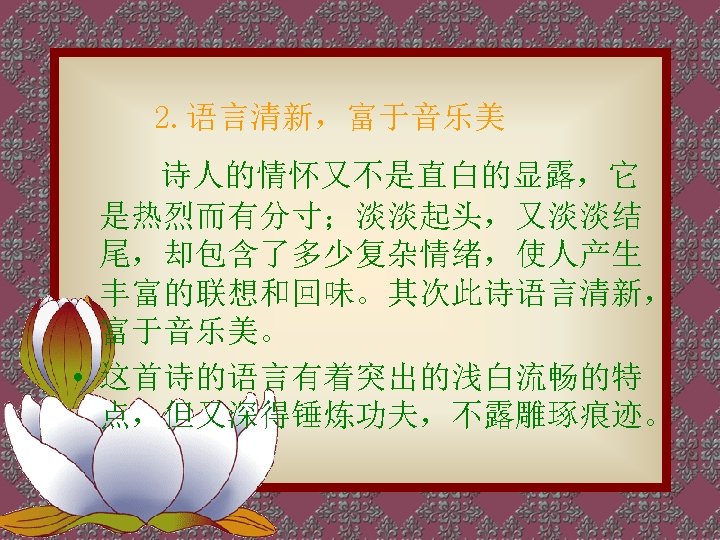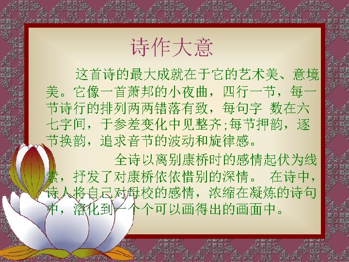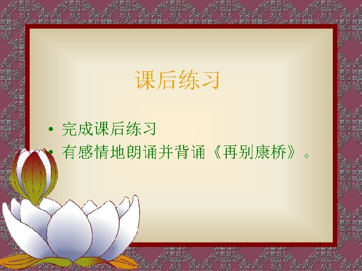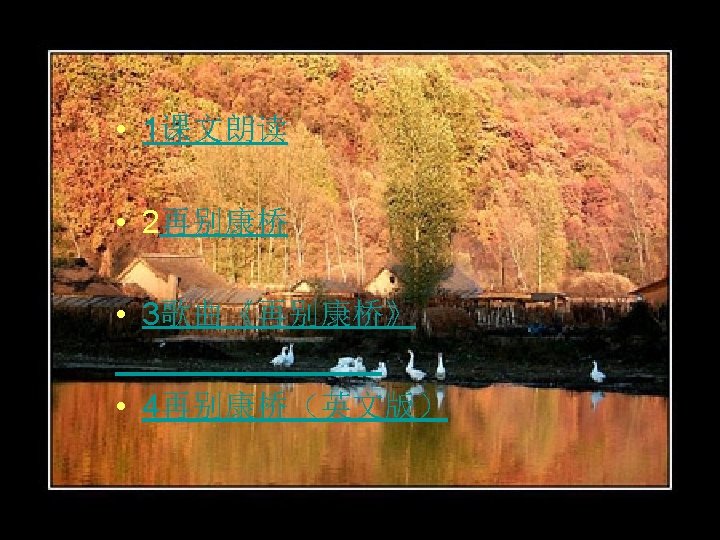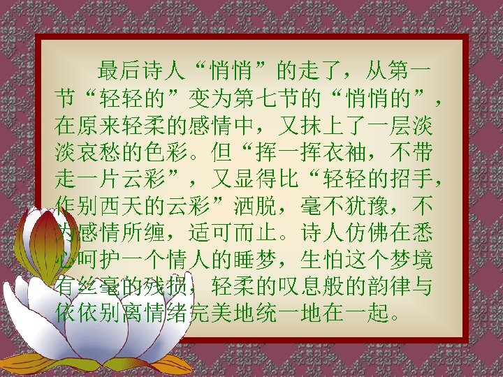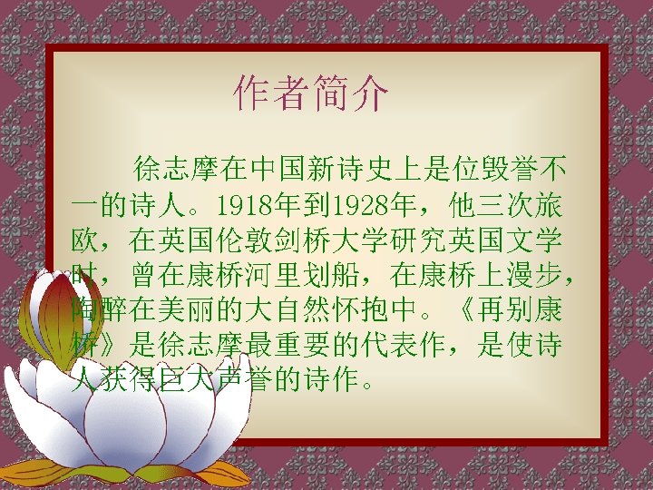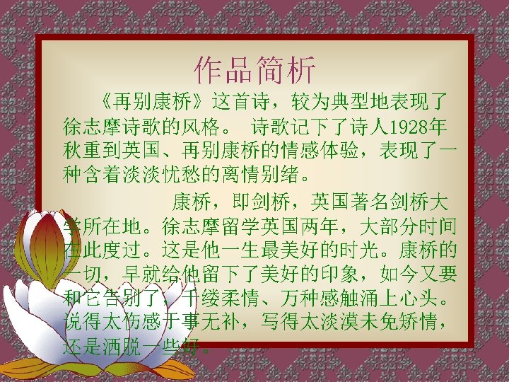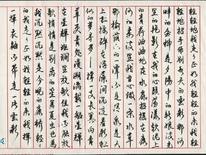 轻轻的我走了, 正如我轻轻的来; 我轻轻的招手, 作别西天的云彩。 那河畔的金柳, 是夕阳中的新娘; 波光里的艳影, 在我的心头荡漾。 Very quietly I take my leave As quietly as I came here; Quietly I wave good-bye To the rosy clouds in the western sky. The golden willows by the riverside Are young brides in the setting sun; Their reflections on the shimmering waves Always linger in the depth of my heart.