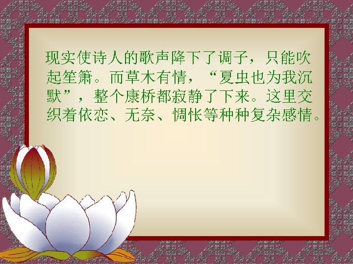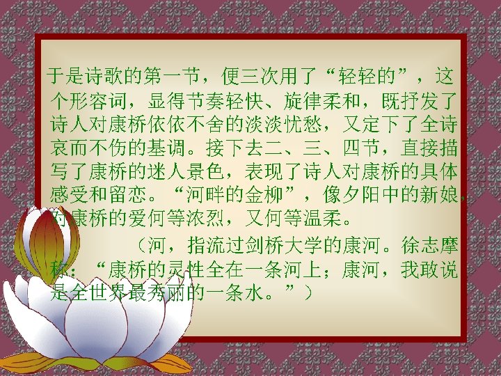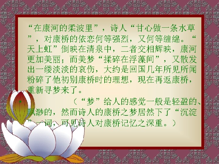 软泥上的青荇, 油油的在水底招摇; 在康河的柔波里, 我甘心做一条水草! The floating heart growing in the sludge Sways leisurely under the water; In the gentle waves of Cambridge I would be a water plant! 那榆荫下的一潭, 不是清泉,是天上虹; That pool under the shade of elm trees Holds not water but the rainbow from the s 揉碎在浮藻间, Shattered to pieces among the duckweeds 沉淀着彩虹似的梦。 Is the sediment of a rainbow-like dream?