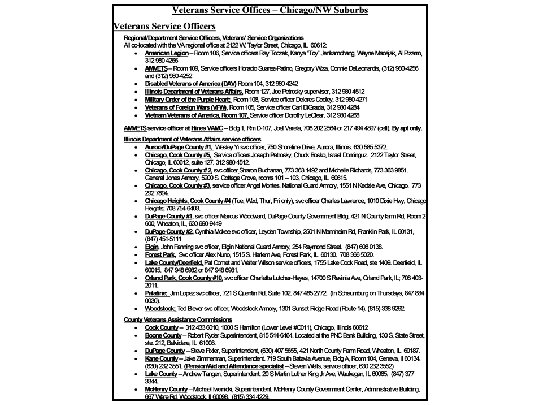 References § Federal Benefits for Veterans (2013, 2014, 2015, 2016, and 2017, 2018, and 2019, Editions) Dependents and Survivors, US Department of Veterans Affairs § VA Health Care Benefits Overview, 2018 Edition, US Department of Veterans Affairs § U. S. Department of Veterans Affairs website at www. va. gov § Jake Zimmerman, Superintendent of the Veterans Assistance Commission of Kane County, Geneva, Illinois. § Wells, Steven, Service Officer of the Veterans Assistance Commission of Kane County, Geneva, Illinois. § Thanks to Captain Lovell FHCC Social Worker Terri Bohlman for information on The VA’s Skilled Home Health and Home Health Aid program. § Thanks to Captain Lovell FHCC RN Joan Pacetti for information on the VA’s Skilled Home Health and Home Health Aid program. § Thanks to Hines VAMC Social Worker Alexi Vahlkamp for information on the VA’s hospice and palliative care benefits. § Military records, www. archives. gov
