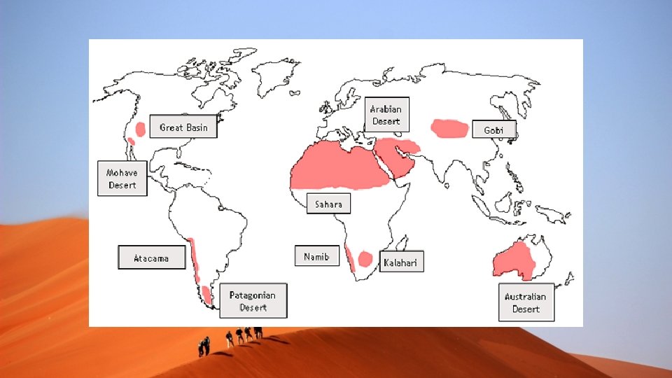 Puščave in polpuščave • Puščave - območja v suhem podnebju, <250 mm padavin Večja količina izhlapele kot prejete vode • Polpuščave – območja v polsuhem podnebju, 250 – 500 mm padavin • Nastanek: 1. na območju subtropskega visokega zračnega pritiska (Sahara) 2. na JZ strani celin, kjer pred obalo tečejo hladni morski tokovi (Atacama in Namib) 3. na zavetrni strani gorskih pregrad ali pa globoki v notranjosti celin 4. puščave katerih nastanek je pospešil človek