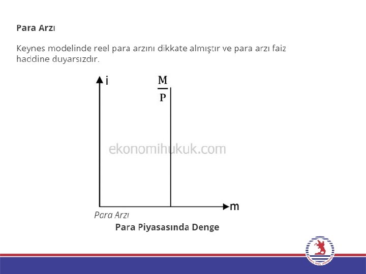 • Keynese göre para piyasasında denge para talebiyle para arzının kesiştiği noktada sağlanır. Bu noktada piyasa denge faiz haddi belirlenir. Para piyasasının dengede olduğu durumda para arzı para talebine ve tahvil arzı da tahvil talebine eşittir. • Para piyasasında para arzının daha fazla olduğu durumda tahvil talep fazlası söz konusudur. Bu durumda ekonomik birimler ellerindeki fazla para ile tahvil alımına yönelirken tahvilin fiyatı artacak faiz oranı düşecek ve spekülatif para talebi artacaktır.