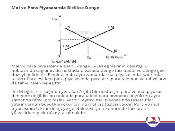 • IS eğrisinin sağında kalan her noktada S>I (Mal Arz Fazlası) olur. Eğrinin solunda kalan her noktada ise I>S (Mal Talep Fazlası) olur. • IS Denklemi: i= A 0/b – 1/ke. b • Is Eğrisinin Eğimi: 1/ke. b • ke: Çarpan • b: Yatırımların faize duyarlılığı • Bir ekonomide çarpan değeri arttıkça ve yatırımların faize duyarlılığı arttıkça IS eğrisi yatıklaşacaktır. çarpan değeri azalırsa ve yatırımların faize duyarlılığı azaldıkça IS eğrisi dikleşir. • Ekonomide çarpan değerini etkileyen marjinal tüketim eğiliminin artması marjinal vergi haddinin ve marjinal ithalat eğiliminin azalması çarpan değerini arttırırken IS eğrisinin yatıklaşmasına neden olur. • c↑, t↓, m↓ toplam harcama fonksiyonunu dikleştirirken, IS eğrisinin yatıklaşmasına neden olur.