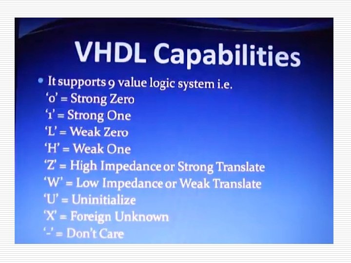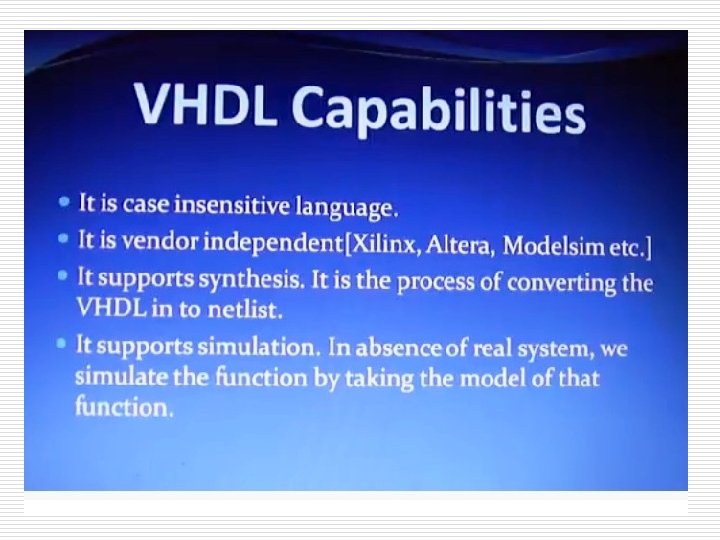 VHDL’s History (Cont. ) The language were first generated in 1981 under the VHSIC program. A number of U. S. companies were involved in designing VHSIC chips for the Department of Defense (Do. D). In July 1983, a team of Intermetrics, IBM and Texas Instruments were awarded a contract to develop VHDL In August 1985, the final version of the language under government contract was released: VHDL Version 7. 2