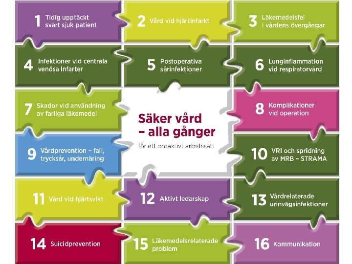 Vi jobbar särskilt inom 16 områden t ex med att förhindra… • vårdrelaterade infektioner • fallskador och trycksår • fel i samband med användning av läkemedel Vi arbetar även med… • att hjärtsjukvården ska bli så bra som möjligt • att införa mobila intensivvårdsteam