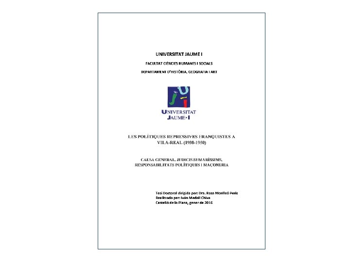 Beques i contractes d’investigació Resp. investigació Fons documentals Catalogació / Digitalització Any Arxiu Municipal Archivo Guerra Civil. AHN. /Centro de la Memoria Historica de Catalogo / Publicació Salamanca 1998 -2005 Arxiu Municipal Sumaríssims Guerra Civil. Arxiu Defensa Castelló 1999 -2005 Notari Lozano, Josep Lluis Archivo Guerra Civil. AHN. /Centro de la Memoria Historica de Treball postgrau Salamanca 2003 Pallares Torres, César Archivo Guerra Civil. AHN. /Centro de la Memoria Historica de Treball Màster Salamanca 2004 Gonzalez Devis, Raul Archivo Guerra Civil. AHN. /Centro de la Memoria Historica de Treball Màster Salamanca. 2005 Vilanova Candau, Victor Archivo General de la Administración / Archivo General Defensa. Tesi Doctoral Sumarisimos 2015 Monlleó Peris, Rosa Centro Documental de la Memoria Historica de Salamanca / Archivo Catalogació Militar Avila /Digitalització 2013 Medall Chiva, Iván Centro Documental de la Memoria Historica de Salamanca / Archivo Catalogació Militar Avila /Digitalització 2014 Grau, Vicent, Medall Chiva, Iván, Archivo Militar Avila / Archivo Historico Nacional Monlleó, Rosa, Fornas, Alfredo Base Dades/ Digitalització Catalogació Digitalització / 2012 Catalogació /Digitalització 2015 Sampedro Ramo, Vicent Centro de la Memoria Historica de Salamanca / Archivo General de la Tesi Doctoral Administración / Archivo General Defensa. Sumarisimos 2016 Medall Chiva, Iván Archivo Historico Nacional / Centro de la Memoria Historica / Archivo Tesi Doctoral General Militar Avila 2016
