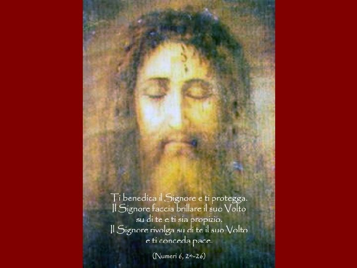 Volto Santo di Cristo, luce che rischiara le tenebre del dubbio e della tristezza, vita che ha sconfitto per sempre il potere del male e della morte, sguardo misterioso che non cessa di posarsi sugli uomini e i popoli, Volto celato nei Segni Eucaristici e negli sguardi di coloro che ci vivono accanto, rendici pellegrini di Dio in questo mondo, assetati d’infinito e pronti all’incontro dell’ultimo giorno. (Benedetto XVI) Santa Madre, deh, Voi fate che le Piaghe del Signore siano impresse nel mio cuore.