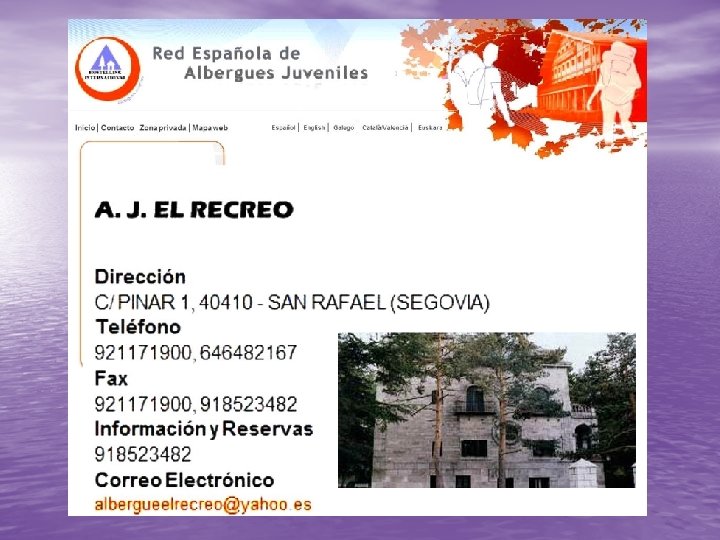 Premier jour Día 6 (martes) / (mardi) abril/ avril • 18, 00 h. Salida para el albergue Départ en car vers l’auberge • 19, 30 h. Llegada a San Rafael. Instalación en el Albergue Juvenil (cerca de Segovia) y cena. Arrivée à San Rafael. Installation à l’auberge de jeunesse ( près de Ségovie) et repas