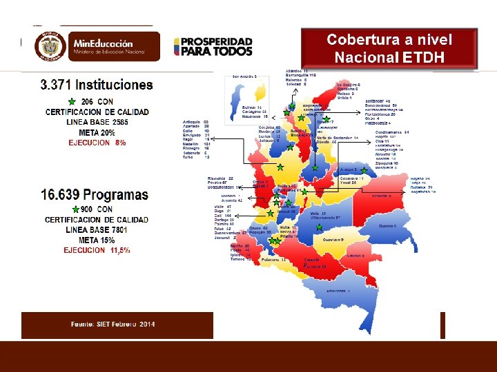 RETOS Y DESAFIOS * RECONOCIMIENTO * CALIDAD * FORTALECIMIENTO INSTITUCIONAL * CONSOLIDACIÓN DE REDES * ARTICULACIÓN CON EDUCACIÓN MEDIA Y SUPERIOR * TRABAJO EN EQUIPO INTERMINISTERIAL E INTERINSTITUCIONAL ACCIONES PRIORITARIAS 2014 1. IMPLEMENTACIÓN DEL MODELO DE ASEGURAMIENTO DE CALIDAD. 2. REALIZACIÓN DE PILOTO DE REDES CON MINISTERIO DE TRABAJO Y SENA. 3. MEJORAMIENTO DE LA GESTIÓN DE ET EN LAS SEC Y EN EL MEN. 4. ASISTENCIA TÉCNICA INTEGRAL A ET. 5. ACOMPAÑAMIENTO A IET EN PROCESO CERTIFICACIÓN. ESTRATEGIAS BASE PARA PROSPECTIVA 20152019 1. 2. 3. 4. 5. DEFINIR ET COMO ALTERNATIVA EN LA POS SECUNDARIA - TERCIARIA. DEFINIR POLÍTICA NACIONAL DESDE ENFOQUE MUNDIAL DE LA ET. DEFINIR DESDE EL MEN DIRECCIÓN PARA ORIENTAR ET EN EL PAIS. DEFINIR MARCO REGULATORIO DE LA ET CONSOLIDAR MODELO DE ASEGURAMIENTO DE LA CALIDAD.