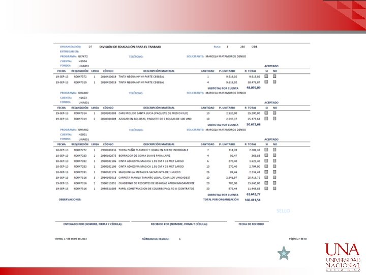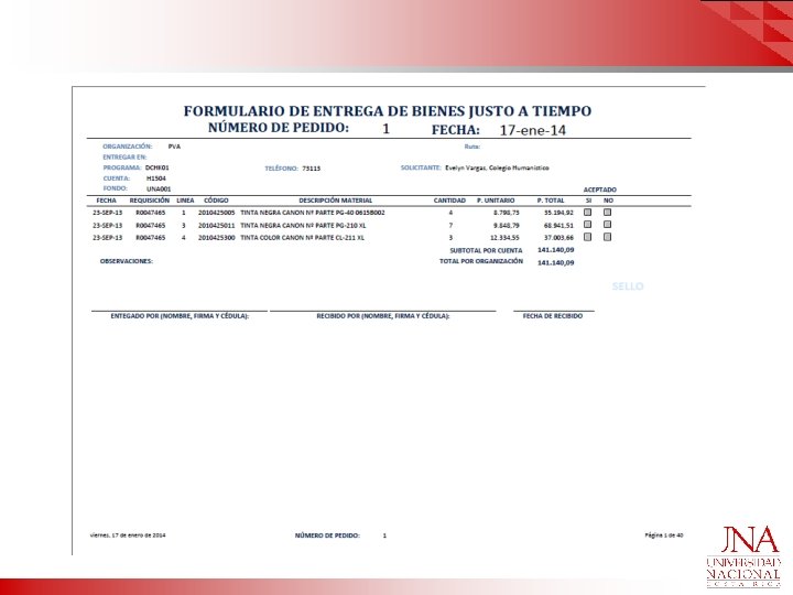 PROCEDIMIENTO PARA LA EJECUCIÓN DEL CONTRATO ( 1 DE 3) El usuario elabora requisición en el sistema en la forma de Bienes de Almacén FZAREQN. Debe utilizar el “Formulario para entrega de bienes”, el cual consta de tres tantos (original y dos copias), el original será para tramitar ante la Proveeduría Institucional, junto con la factura para el cobro mensual respectivo, una copia para la Unidad solicitante y la otra para el Contratista. El Almacén Institucional emite reporte FZRPSCP de requisiciones de Almacén pendientes de surtir con presupuesto y lo envía a J&T según programación de rutas. El Contratista procede a realizar la entrega de los bienes solicitados en cada Unidad Usuaria de la Universidad que lo requiera contra pedido según tipo de bien