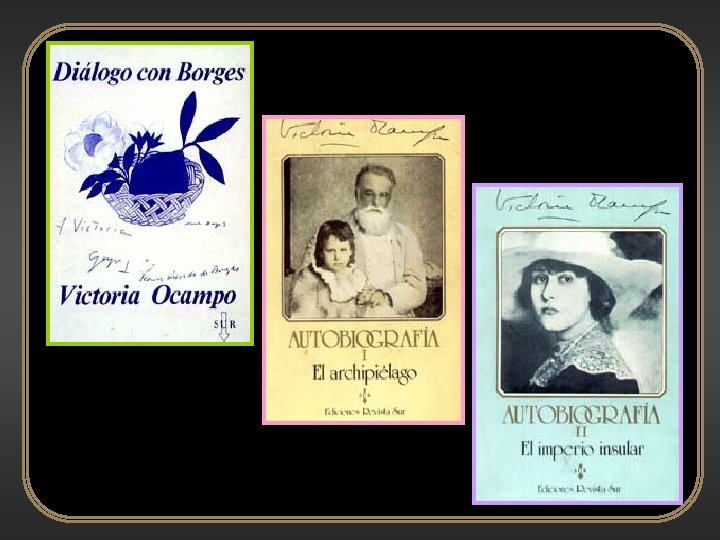 De Francesca a Béatrice (epílogo de Ortega y Gasset) (1924) La laguna de los Nenúfares (fábula escénica), Revista de Occidente, Madrid. (1926) Testimonios Primera serie, Ed. Revista de Occidente, Madrid. (1935) Supremacía del alma y de la sangre (1935) Domingos en Hyde Park, Ed. Sur (1936) San Isidro con un poema de Silvina Ocampo y 68 fotografías de Gustav Torlichen. Ed. Sur(1936) Virginia Woolf, Orlando y Cía. (1938) Testimonios. Segunda Serie (1941) 338. 171 T. E. , Ed Sur (1942) Testimonios. Tercera Serie (1946) Soledad sonora (Testimonio cuarta serie) Ed. Sudamericana (1950) El viajero y una de sus sombras (Keyserling en mis memorias) Ed. Sudamericana (1951) Lawrence de Arabia y otros ensayos Ed. Sur (1951) Virginia Woolf en su diario Ed. Sur(1954) Testimonios. Quinta Serie Ed. Sur (1957) Habla el algarrobo (teatro) Ed. Sur (1959) Tagore en las barrancas de San Isidro (1964) Testimonios. Sexta Serie (1964) Juan Sebastián Bach, el hombre (1964) La belle y sus enamorados (1964) Jawaharlal Nehru: antologia (selección y prefacio) (1966) Testimonios. Séptima Serie (1967) Diálogo con Mallea (1969) Diálogo con Borges (1969) Testimonios. Décima serie (1977) Autobiografía Volumen 1 (El Archipiélago) (1979) Autobiografía (1979 -1984) volúmenes 2 al 6