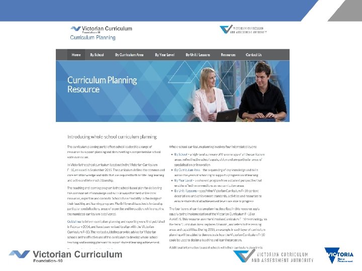Presentation based on these guidelines The guidelines provide advice on the effective use of the curriculum to develop whole-school teaching and learning plans and to report student learning achievement http: //www. vcaa. vic. edu. au/Pages/foundation 10/viccurriculum/curriculumplanning. aspx