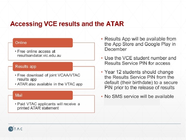 Overview of application process Submit VTAC course application online via www. vtac. edu. au from 6 August 2018 & BEFORE 27 September 2018 to avoid late fees ATAR released from 7 am Friday 14 December, 2018 Change of preference open until 12 pm Wednesday 19 December, 2018 Pay application processing fee BEFORE 12 pm, 19 December 2018 VTAC processes application supplying results to course authorities for each course listed Course authorities consider application and advise VTAC if they want to make an offer VTAC notifies applicant of the highest course offer for the current round. First Round offers released 16 January, 2019 Accept, defer or decline the offer with institution. Change preferences if desired If successful, offers for courses higher on a student’s preference list will be made in subsequent offer rounds