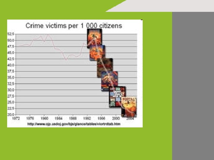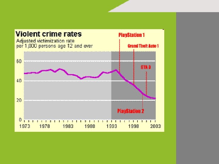 H Jenkins – 8 myths 1. The availability of video games has led to an epidemic of youth violence. - rate of juvenile violent crime in the United States is at a 30 -year low. - people serving time for violent crimes typically consume less media before committing their crimes than the average person in the general population. - young people in general are more likely to be gamers — 90 percent of boys and 40 percent of girls play. - -The overwhelming majority of kids who play do NOT commit antisocial acts. - - strongest risk factors for school shootings centered on mental stability and the quality of home life