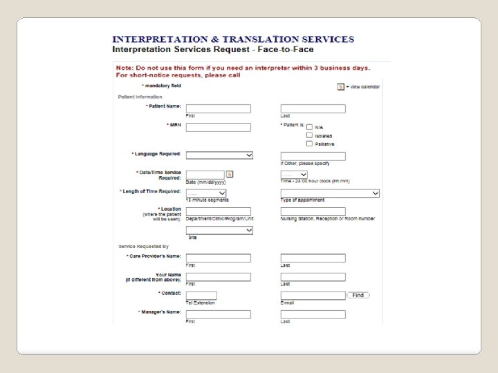 Emergency department � Informal interpretation services provided by family, untrained staff, other patients, visitors. � Call 13 -6400 to ask if qualified interpreter available from registered working staff. Inpatient departments � Complete Interpretation Request Form on Hospital A website for specific date and time requests. � Informal interpretation services including family, untrained staff, patients, visitors (used for day to day translation) � Call 13 -6400 to see if a qualified interpreter available from registered working staff. Outpatient departments � Determine need for interpreter services before appointment confirmed � Complete the interpretation Request Form on Hospital A website for specific date and time requests. � Call 13 -6400 to see if a qualified interpreter available from registered working staff. If not then informal interpretation services including family, untrained staff, and visitors used. Current State of Accessing Interpreter Services at Hospital A