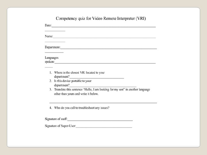 �Resulting in: ◦ Increased medical errors ◦ Decreased provision of evidence-based medical care ◦ Increased health care costs & ◦ Poor patient outcomes (Ramos et al. , 2014) Overview: Video Remote Interpreter (VRI)