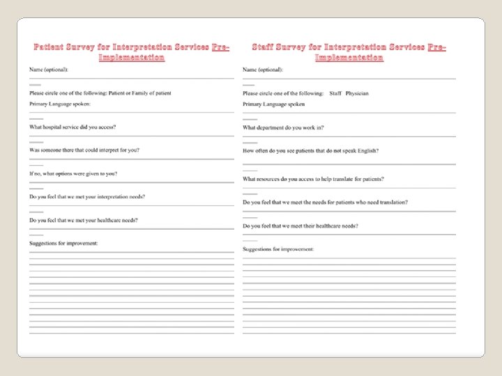 � Pre-implementation qualitative surveys to be sent out to determine the need and identify gaps in translation using current systems. ◦ Survey sent to patients in their identified primary language. Evaluation Plan