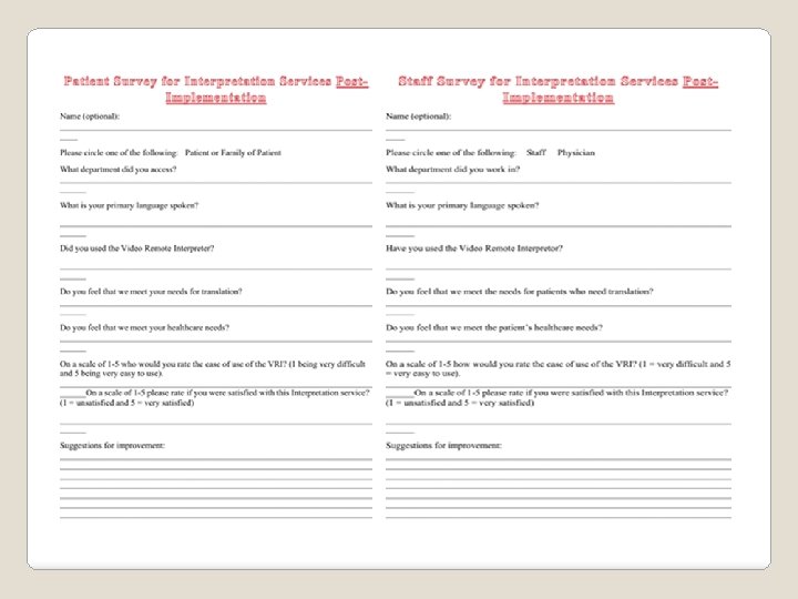 � Post-implementation qualitative surveys given out to staff and patients to determine improvement in services and decrease in communication gaps using VRI. Evaluation Plan
