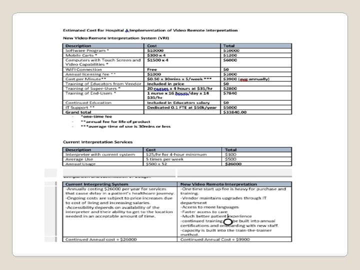 Little research available on cost to healthcare system when interpretation services not adequately provided (Access Alliance, 2009). However, quality of care for patient and increased patient satisfaction scores are priceless. Cost Benefit Analysis