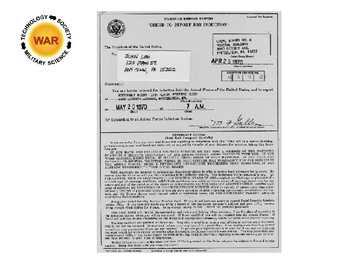 The Draft The First Draft Lottery December 1, 1969 Washington, DC Determined order of draft for 1970 Young men 19 to 26 years old