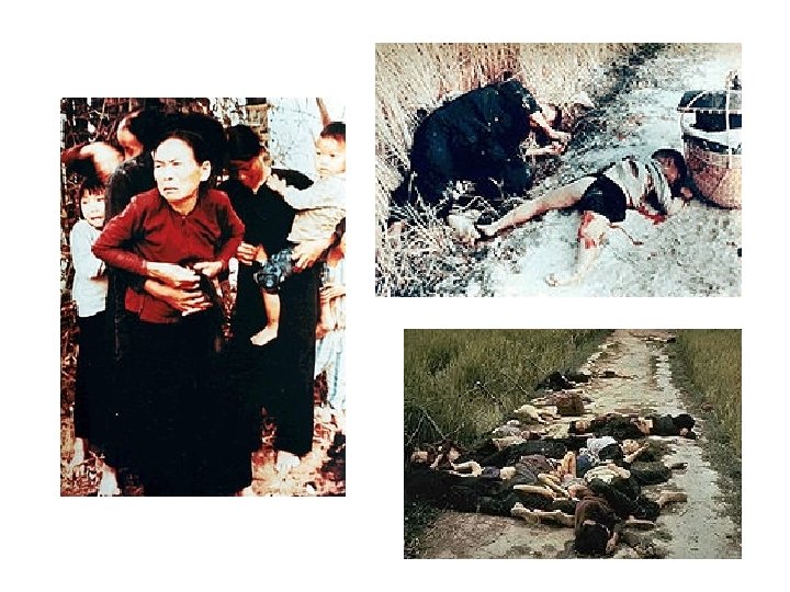 My Lai Massacre • March 1968 • Thought village housed Viet Cong but none found • 500 people including women, children and the elderly were killed • Higher-ranking U. S. Army officers covered up events for a year • In 1970, a U. S. Army board charged 14 officers of crimes related to the events at My Lai; only one was convicted