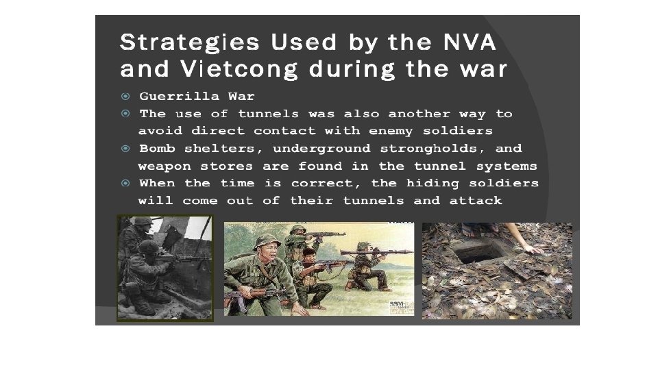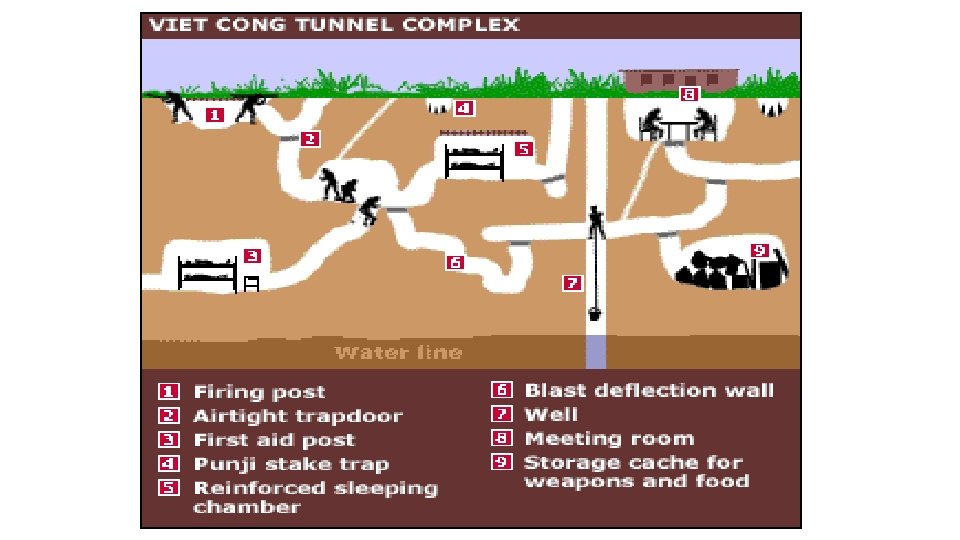 Vietcong • Lacking the firepower of the American forces, the Vietcong used ambushes, booby traps, and other guerrilla tactics. These techniques could be greatly destructive. • The Vietcong also frustrated American troops by blending in with the general population and then quickly vanishing.