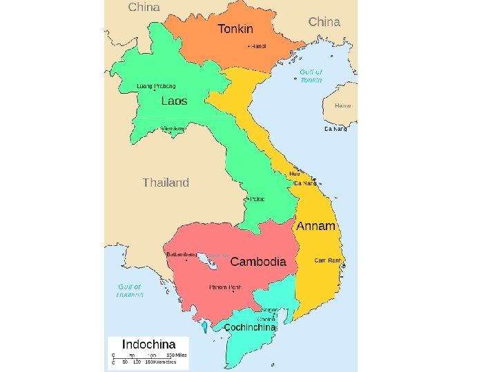Vietnam • Ancient history: Cambodia, Laos, and Vietnam have common culture & religion. All trade and fight with • Approximately 200 BC – 939: China is in fact controlled by Vietnam • 939: Vietnam a separate country • French take over Cambodia, Laos and Vietnam in 1880’s. French Indochina (by 1893). • In Vietnam three different French administration centers: in the North (Tonkin), Center (Annan) and South (Cochina) • A number of anti-colonialist movements, a significant Vietnamese elite educated in France and other Western countries • E. g. 1885 0 1889 Cần Vương insurgency, 1916 Cochina uprising, 1917 Thái Nguyên uprising • 1940 – France loses Vietnam to Japan after the defeat to Germany. March 1945 – the French removed by Japan from Vietnam. Japan rules through Bảo Đại • WW II sparks anti-collonialist guerillas. E. g Viet Minh – created in 1941 (Ho Chi Minh) • August 1945 – August Revolution – Viet Minh seizes control of Hanoi (North administration capital) • Ho Chi Minh’s power also recognized in the South (emperor of South Vietnam Bảo Đại abdicates) • Democratic Republic of Vietnam (DRV) created in September 1945 • The French return in 1946 to reclaim their colonies in Indochina