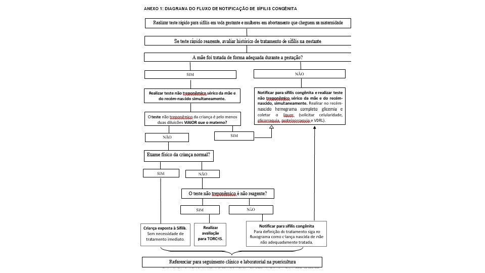 PRIMEIRA AVALIAÇÃO DO RN PARA SÍFILIS NA MATERNIDADE Não notificar; realizar avaliação e manejo clínico conforme PCDT TV, 2019. Notificar; realizar avaliação e manejo clínico conforme PCDT TV, 2019.