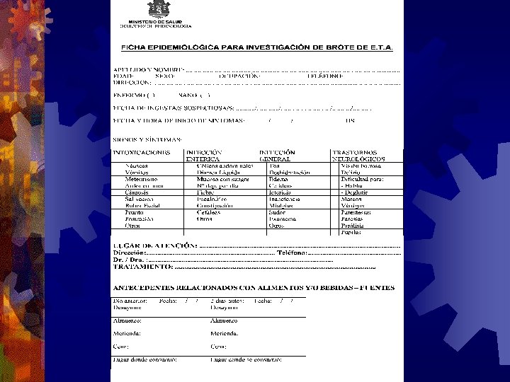 Estudios de Cohortes en ETA Método: ® Identificar la cohorte: ® Típicamente son todas las personas que compartieron una comida o miembros de una población que han estado expuestos ® Definir el factor de exposición de interés, como los items del menú, fuentes de agua, etc. ® Comparar las tasa de ataque en aquellos expuestos y no expuestos