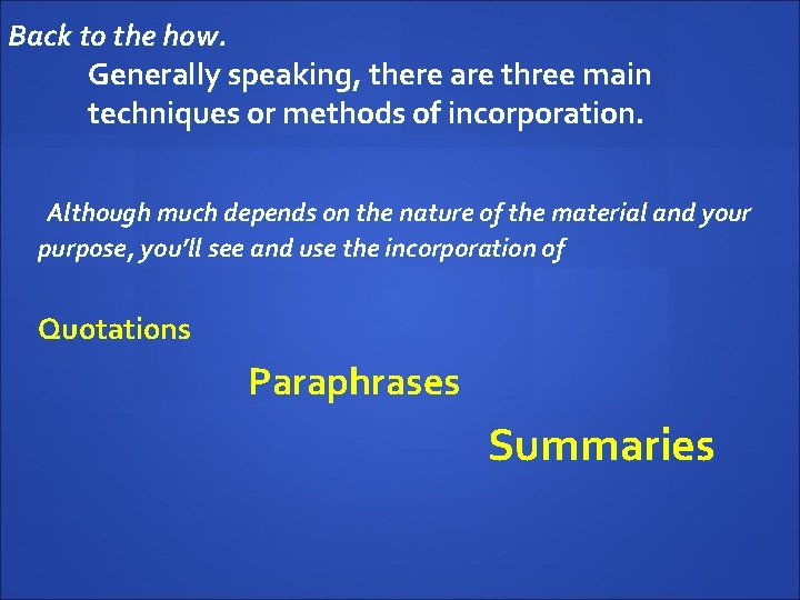 Back to the how. Generally speaking, there are three main techniques or methods of incorporation. Although much depends on the nature of the material and your purpose, you’ll see and use the incorporation of Quotations Paraphrases Summaries