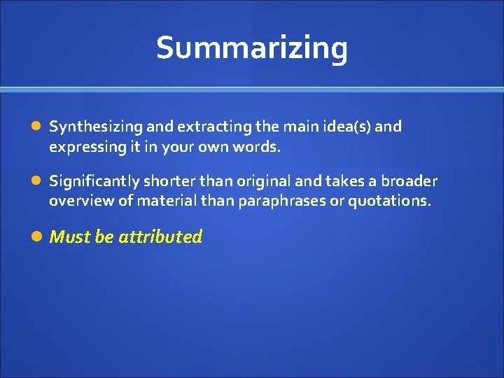 Summarizing Synthesizing and extracting the main idea(s) and expressing it in your own words. Significantly shorter than original and takes a broader overview of material than paraphrases or quotations. Must be attributed