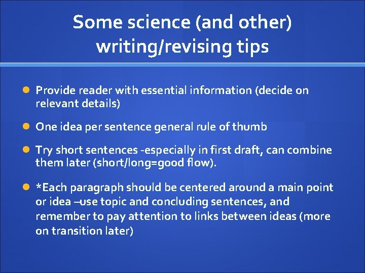 Some science (and other) writing/revising tips Provide reader with essential information (decide on relevant details) One idea per sentence general rule of thumb Try short sentences -especially in first draft, can combine them later (short/long=good flow). *Each paragraph should be centered around a main point or idea –use topic and concluding sentences, and remember to pay attention to links between ideas (more on transition later)