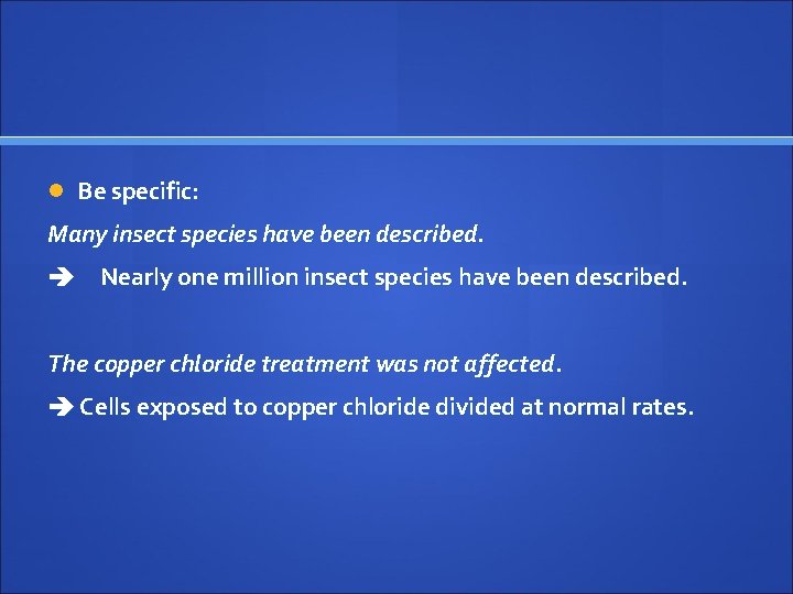 Be specific: Many insect species have been described. Nearly one million insect species have been described. The copper chloride treatment was not affected. Cells exposed to copper chloride divided at normal rates.