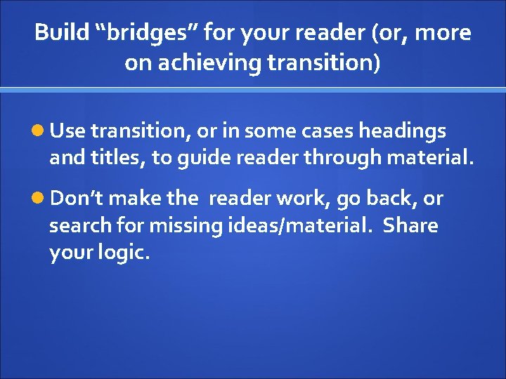 Build “bridges” for your reader (or, more on achieving transition) Use transition, or in some cases headings and titles, to guide reader through material. Don’t make the reader work, go back, or search for missing ideas/material. Share your logic.