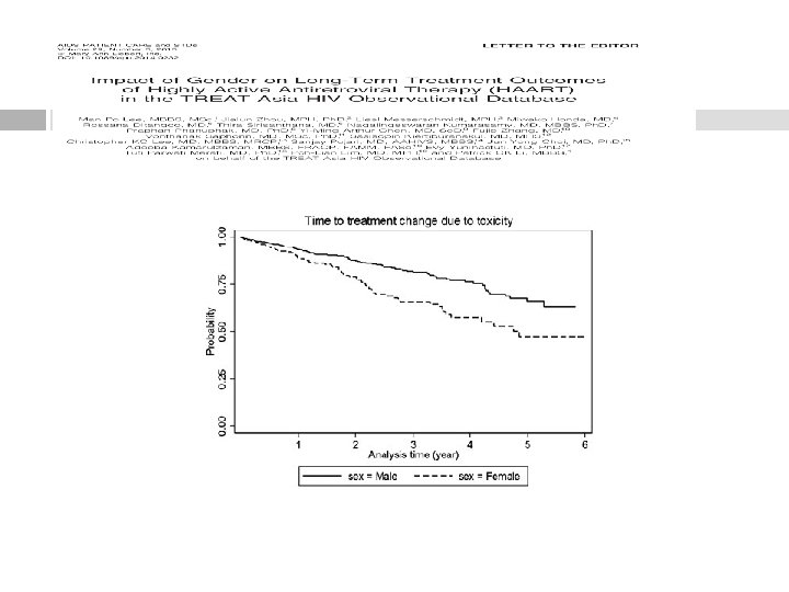 Etude multicentrique observationnelle depuis 2003 en Asie 3899 patients suivis sur 3. 6 années Augmentation proportion de femme 21% à 35% Pas de facteur prédictif pour une évolutivité vers un stade SIDA ni décès. (adjusted HR 0. 83, 95% CI 0. 62– 1. 10, p = 0. 186) Ni de perdus de vue (adjusted HR 1. 04, 95% CI 0. 8– 1. 2, p = 0. 796). Les femmes avaient une CV plus faible que les hommes à 96 mois de l’instauration du traitement. En revanche, elles changeaient plus de traitement du fait de toxicité (adjusted HR 1. 9, 95% CI 1. 4– 2. 7, p < 0. 001; Fig. 1). Zhou J, Kumarasamy N, Ditangco R, et al. The TREAT Asia HIV Observational Database: Baseline and retrospective data. J Acquir Immune Defic Syndr 2005; 38: 174– 179. Impact of Gender on Long-Term Treatment Outcomes of Highly Active Antiretroviral Therapy (HAART) in the TREAT Asia HIV Observational Database Man Po Lee, AIDS PATIENT CARE and STDs Volume 29, Number 5, 2015