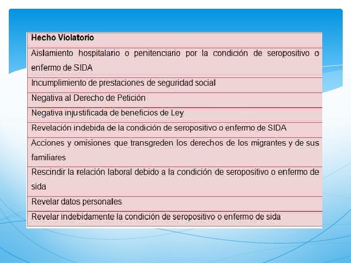 Derechos de los pacientes con VIH Sin importar su condición de enfermedad, de acuerdo con el ONUSIDA (2008), las personas que viven con VIH/SIDA tienen derecho a: A recibir atención médica de calidad A recibir apoyo e información sobre su enfermedad A contraer matrimonio y a fundar una familia. A la intimidad. A disfrutar de los adelantos científicos y de sus aplicaciones. A la libertad de circulación. A pedir asilo y a disfrutar de él. A la seguridad. A la educación. Al trabajo. A la libertad de reunión y asociación. A la libertad de expresión. A la participación a la vida política. A un nivel de vida adecuado. A no ser sometido a penas o tratos inhumanos o degradantes.