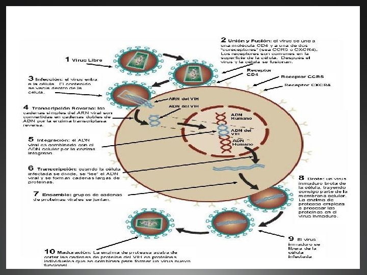 VIRUS DE INMUNODEFICIENCIA HUMANA ARN Transcriptasa inversa VIH-I Rodeado de una cápsula de proteínas que rodea la molécula de ARN portadora del código genético del virus. (América) VIH-II Pertenece a la misma familia, es similar, solo difiere en las proteínas de la cubierta. (África)