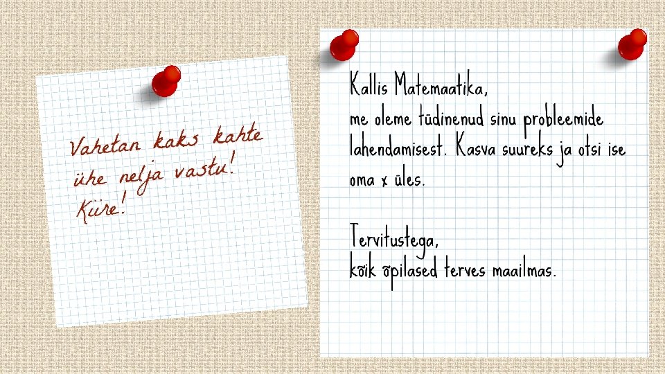 Kaheksanda klassi matemaatikatund. Õpetaja on väga vihane. Korraga käratab: „Taavi ja Gert! Mida te teete seal laua all… Ma ütlesin! Ei kasuta arvutit!“ Taavi: „Mmm-m-me-e ei ka-kasutagi. “ Õpetaja: „Mida te siis teete? “ Taavi: „Arvutame näppude peal!“