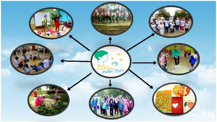 • UŽDAVINIAI • • • Patirti meninius išgyvenimus ir plėtoti bendruosius gebėjimus išreikiant savo sumanymus, mintis ir jausmus netradicinėmis meno priemonėmis Pratinti vaiką darželyje ir namuose kasdien valgyti vaisius ir daržoves Sudaryti sąlygas ir ugdyti vaikų poreikį dalyvauti įvairioje sportinėje veikloje Tobulinti judesių koordinaciją, atliekant įvairius mankštos pratimus Supažindinti su dantukų priežiūra, skatinant laikytis burnos higienos reikalavimų Patirtas emocines išraiškas perteikti piešiniuose bei gėrėtis atliktų darbų paroda Įtraukti tėvus į projekto veiklą, siekiant įstaigos ir šeimos vientiso bendradarbiavimo