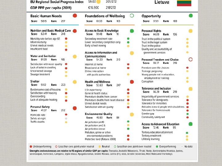 LITHUANIA: HIGHEST COMPONENT SCORES NUTRITION AND BASIC MEDICAL CARE 97, 3 WATER AND SANITATION 96. 35 ACCESS TO BASIC KNOWLEDGE 96. 30 PERSONAL RIGHTS 93. 97 LOWEST COMPONENT SCORES ACCESS TO ADVANCED EDUCATION 49. 79 INCLUSIVENESS 63. 54 HEALTH AND WELLNESS 67. 84