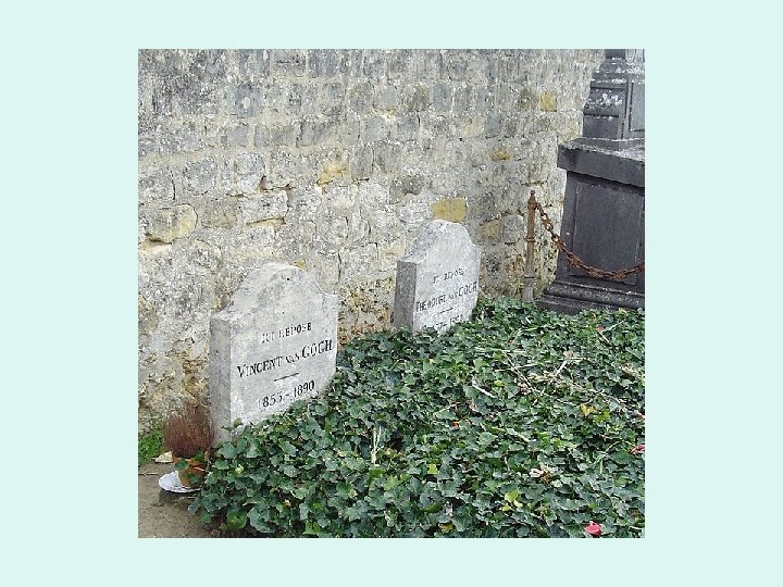 Vincent Van Gogh • At age 37, he walked out of the hospital into a field and shot himself. • He survived the immediate impact, went back inside and was pronounced dead 2 days later. • Theo fell ill, and died 6 months after Vincent. They are buried next to one another.