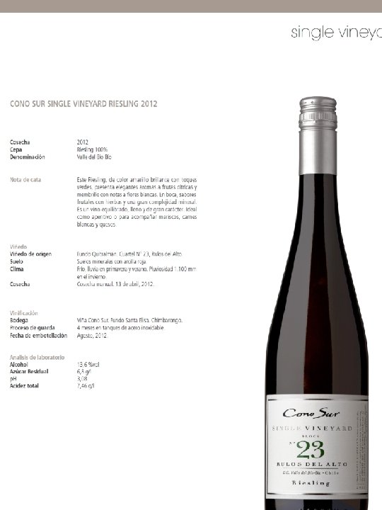 Nº VINO PAIS AÑO ALCOHOL 1 2 CONO SUR PRINZ VON PREUSSEN MITCHEL DOPFF & IRON FELTON ROOD HIRSCH CHILE ALEMANIA 2012 AUSTRALIA ALSACIA NUEVA ZELANDA AUSTRIA 3 4 5 6 ACIDEZ TOTAL 7, 46 g/l 7, 6 g/l PRECIO 13, 6% 11, 5% AZUCAR PH RESIDUAL 6, 8 G/L 3, 08 8, 4 g/l 2010 12, 5% 15, 60 € 10, 81 € 2008 12% 14, 40 € 2004 12% ¿? ? ? 14, 40 € 12, 61 €