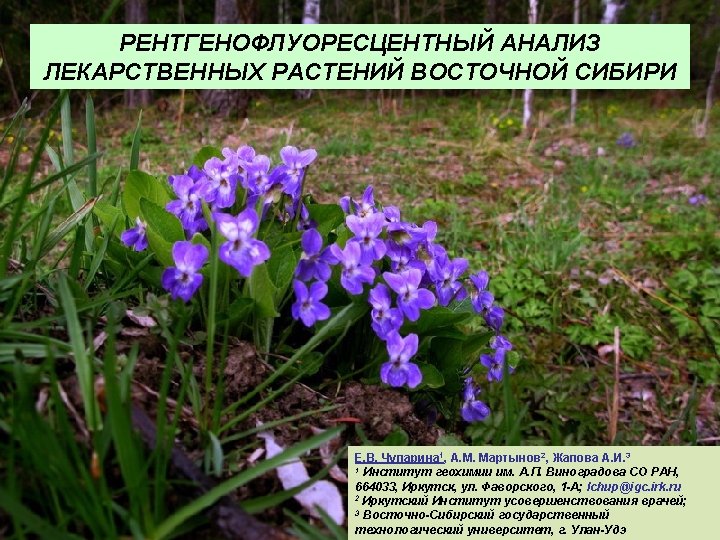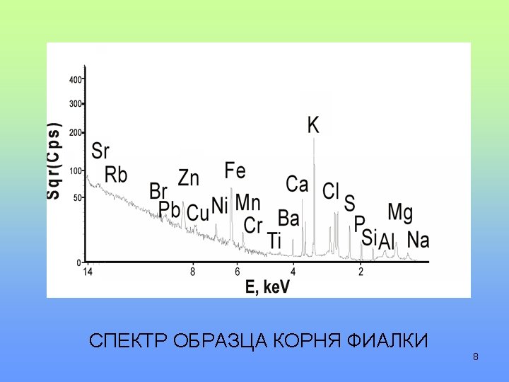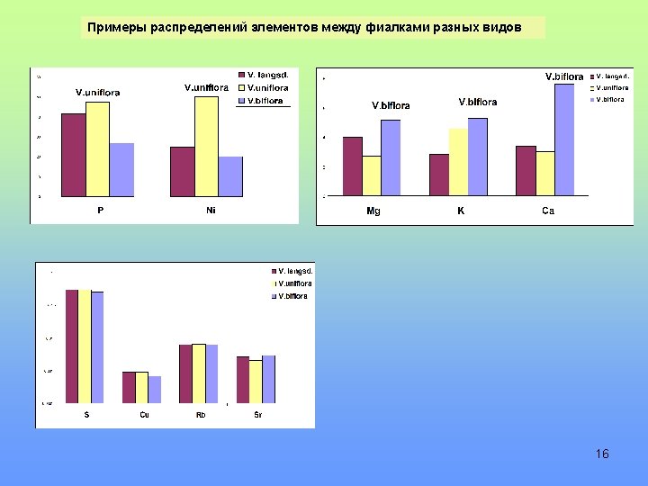 ЕЛЕМЕНТНЫЙ СОСТАВ ОРГАНОВ ФИАЛКИ ПЕСЧАНОЙ VIOLA ARENARIA DC. элемент стебель листья цветки Содержание, % K Fe Ca Si Mg Na S P Cl 4, 02 0, 608 0, 195 0, 053 0, 134 0, 18 0, 28 3, 35 0, 02 0, 77 0, 133 0, 394 0, 032 0, 243 0, 242 0, 309 3, 72 0, 023 0, 48 0, 121 0, 395 0, 29 0, 232 0, 261 0, 135 Содержание, мкг/г Al Ba Br Mn Cu Ni Rb Pb Sr Ti Zn 1020 155 1 81 6 2 21 <3 57 24 46 620 57 2 147 10 4 28 <3 44 20 76 1200 25 500 <1 152 300 -500 11 20 -100 5 10 -100 30 <3 30 -300 21 36 50 -200 91 100 -400 Мартынов А. М. , Чупарина Е. В. Фиалка песчаная новый источник макро- и микроэлементов // Сиб. мед. журнал. - 2008, № 3. - С. 98 -99. 15