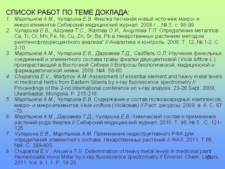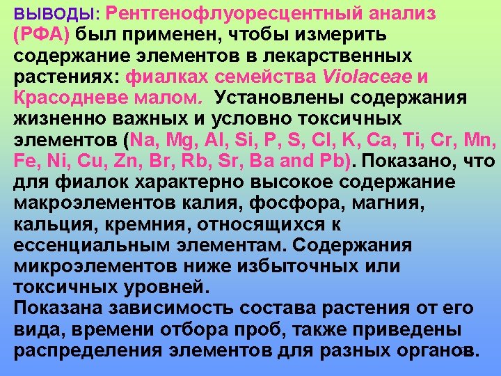 ЕЛЕМЕНТНЫЙ СОСТАВ ОРГАНОВ ФИАЛКИ ПЕСЧАНОЙ VIOLA ARENARIA DC. элемент стебель листья цветки Содержание, % K Fe Ca Si Mg Na S P Cl 4, 02 0, 608 0, 195 0, 053 0, 134 0, 18 0, 28 3, 35 0, 02 0, 77 0, 133 0, 394 0, 032 0, 243 0, 242 0, 309 3, 72 0, 023 0, 48 0, 121 0, 395 0, 29 0, 232 0, 261 0, 135 Содержание, мкг/г Al Ba Br Mn Cu Ni Rb Pb Sr Ti Zn 1020 155 1 81 6 2 21 <3 57 24 46 620 57 2 147 10 4 28 <3 44 20 76 1200 25 500 <1 152 300 -500 11 20 -100 5 10 -100 30 <3 30 -300 21 36 50 -200 91 100 -400 Мартынов А. М. , Чупарина Е. В. Фиалка песчаная новый источник макро- и микроэлементов // Сиб. мед. журнал. - 2008, № 3. - С. 98 -99. 15