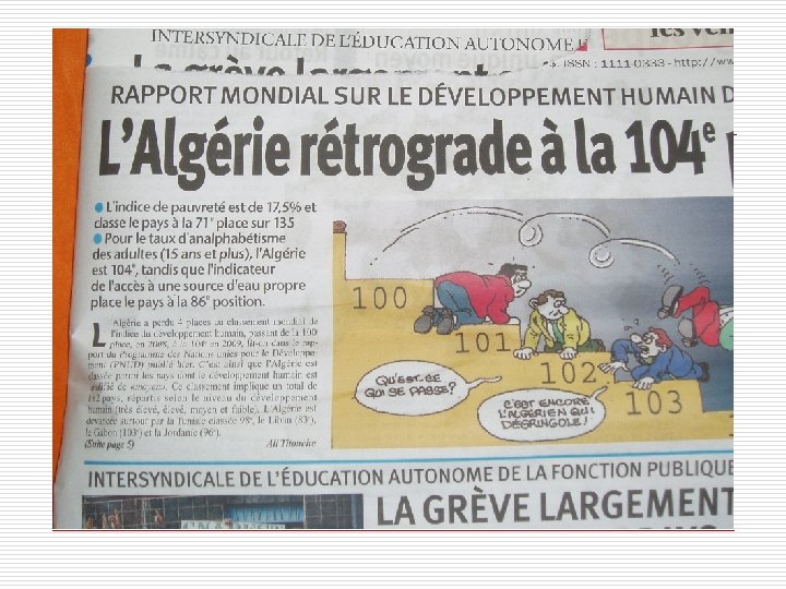 Violence symbolique - Pauvreté et misère Chômage et injustice sociale Manque de loisirs Rôle et statut de la femme Altération de la qualité de vie (environnement) Mais aussi Absence de liberté et de démocratie Etat autoritaire/terreur Etat laxiste, absent ou démissionnaire (climat d’insécurité) Développement humain et droits humains