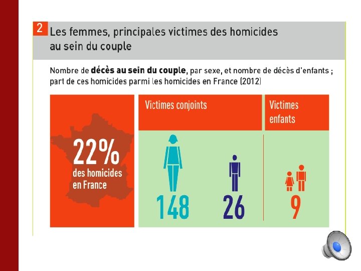 Violences faites aux femme dans le monde • Une femme sur trois a subi des violences physiques et/ou sexuelles exercées par un partenaire intime, ou des violences sexuelles infligées par un partenaire non intime • une femme sur cinq est victime de viol ou de tentative de viol au cours de sa vie • Une femme tuée sur deux a été assassinée par son conjoint, moins d’un homme sur 20