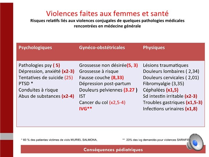 2) 51 médecins Généralistes et spécialistes et 2 sages femmes LAZIMI – 2007 • 557 patientes interrogées de façon systématique : • 63% ont déclaré avoir été victimes de violences : • 62, 8% de violences verbales, • 42, 7% de violences physiques, • 17, 8% de violences sexuelles.