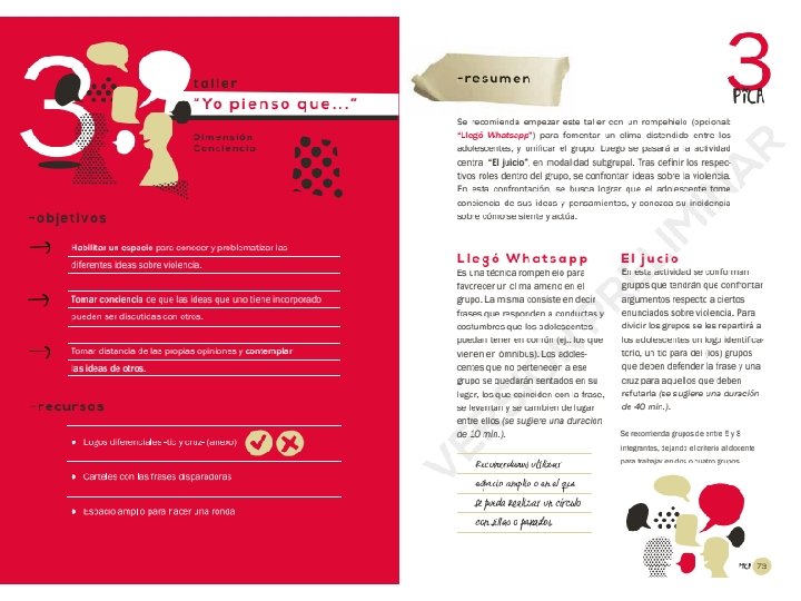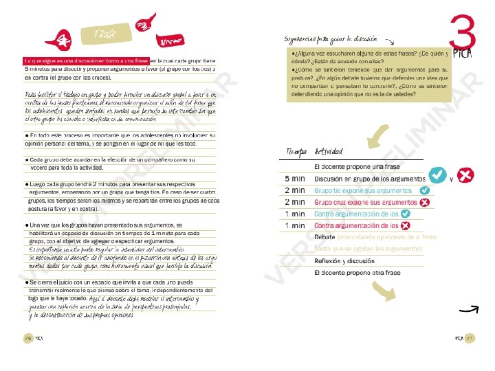 - Dos grupos de discusión identificados por tics y cruces. (A favor y en contra) - Una frase disparadora(Ej. “la juventud está perdida”) - Tiempos: - - 5 minutos para intercambiar dentro del grupo - - 2 minutos para argumentar - - 2 minutos para contra argumentar - Puesta en común