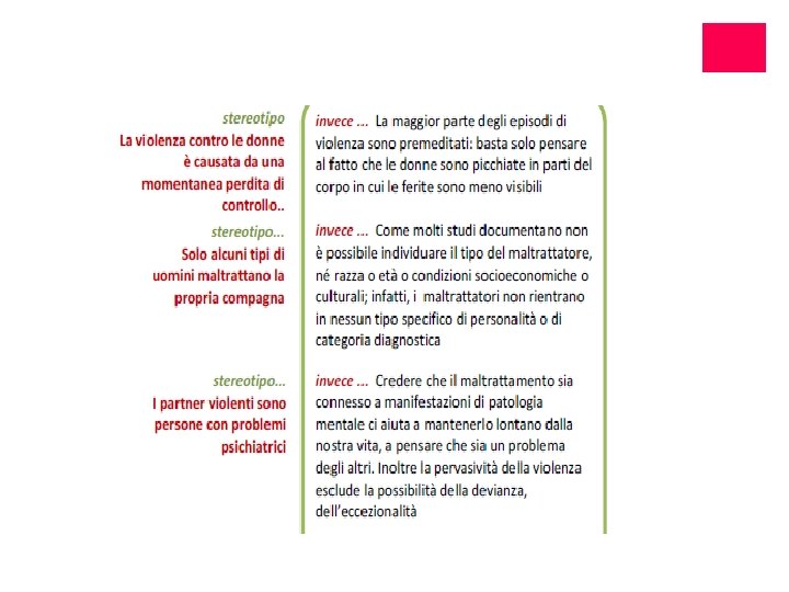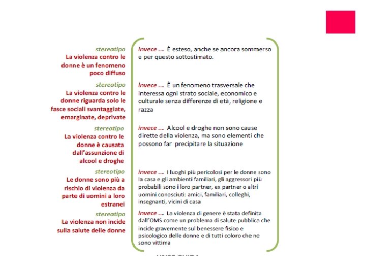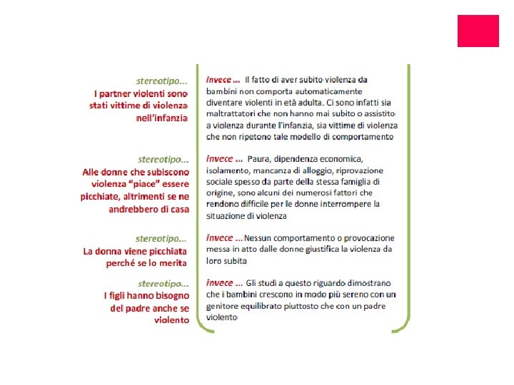 PERCHÉ LA DONNA MALTRATTATA NON SE NE VA? ¡Interiorizzazione degli stereotipi culturali ¡Paura delle reazioni del partner ¡Paura di non essere creduta e/o sostenuta ¡Mancanza di risorse materiali ¡Le persone di cui si fida le consigliano di ripensarci (figli, famiglia, religione, cultura) ¡Colpevolizzazione da parte della famiglia, delle istituzioni, dei conoscenti ¡Sfiducia nell’esistenza di un’alternativa percorribile ¡Tenere unita la famiglia per il bene dei figli